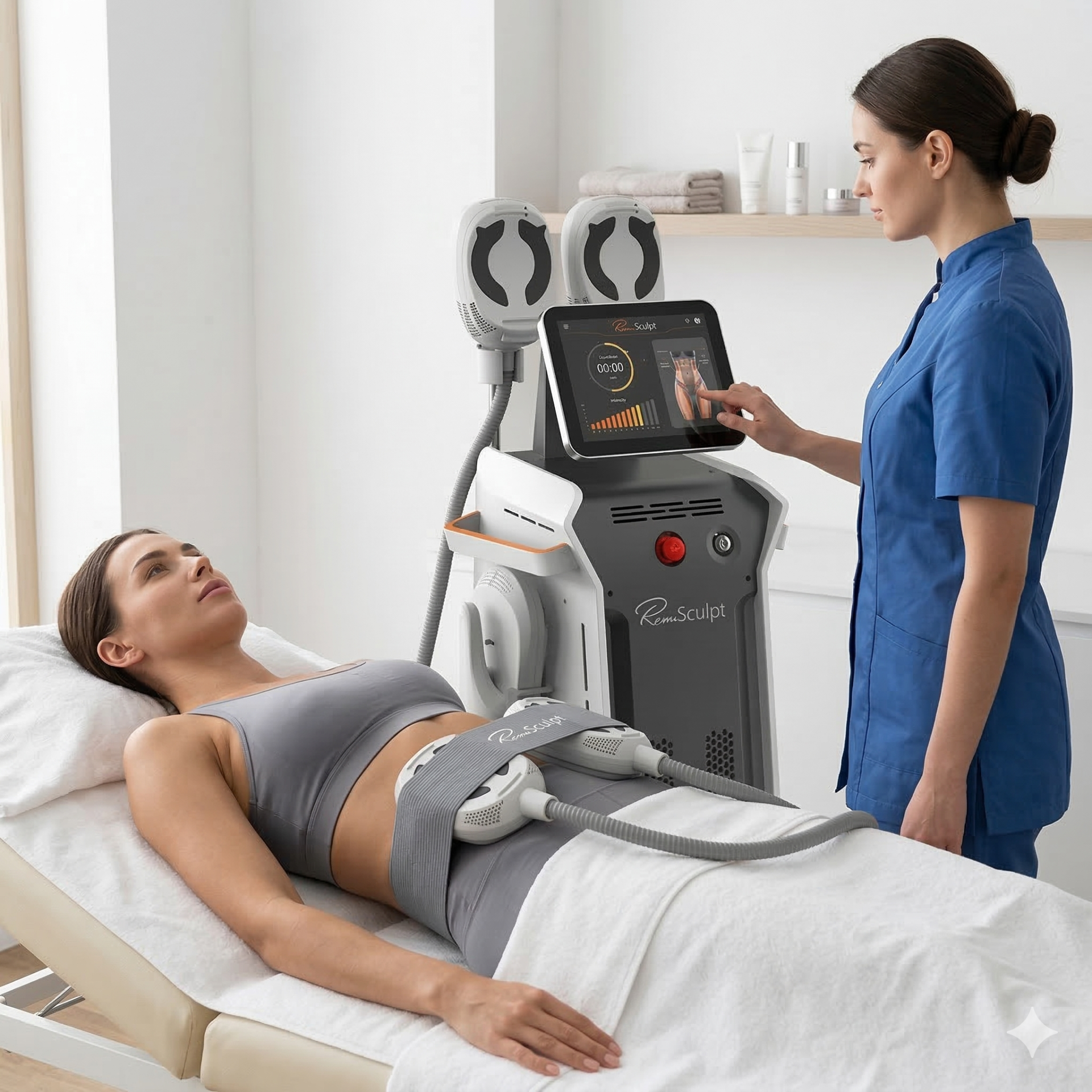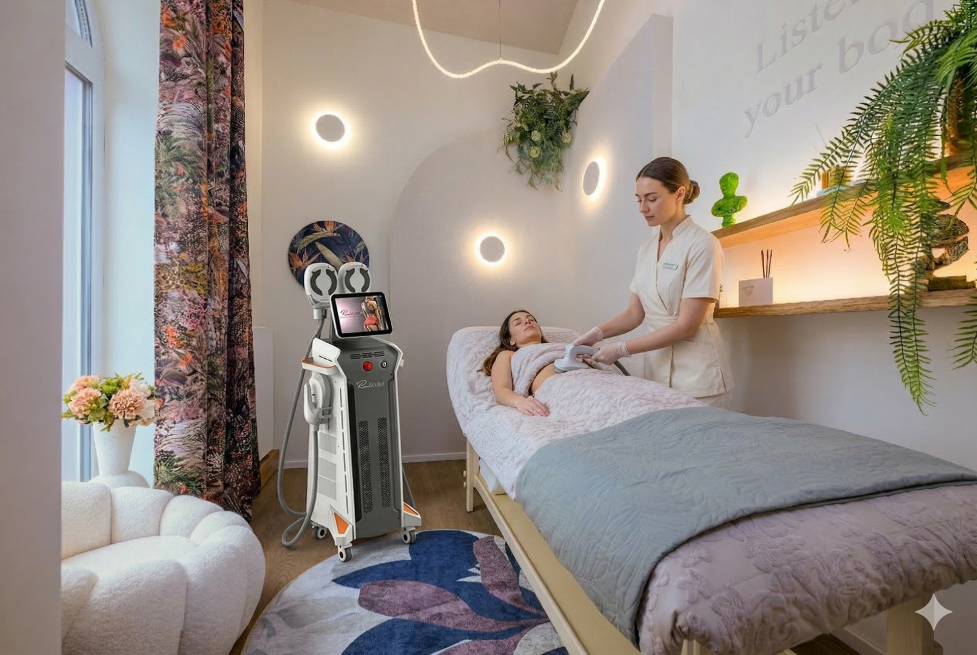 Představujeme vám revoluci v neinvazivním tvarování těla. Náš salon disponuje nejvýkonnější variantou přístroje Renasculpt, který kombinuje vysokovýkonné elektromagnetické svalové stimulace (EMS) s technologií RF (radiofrekvence).